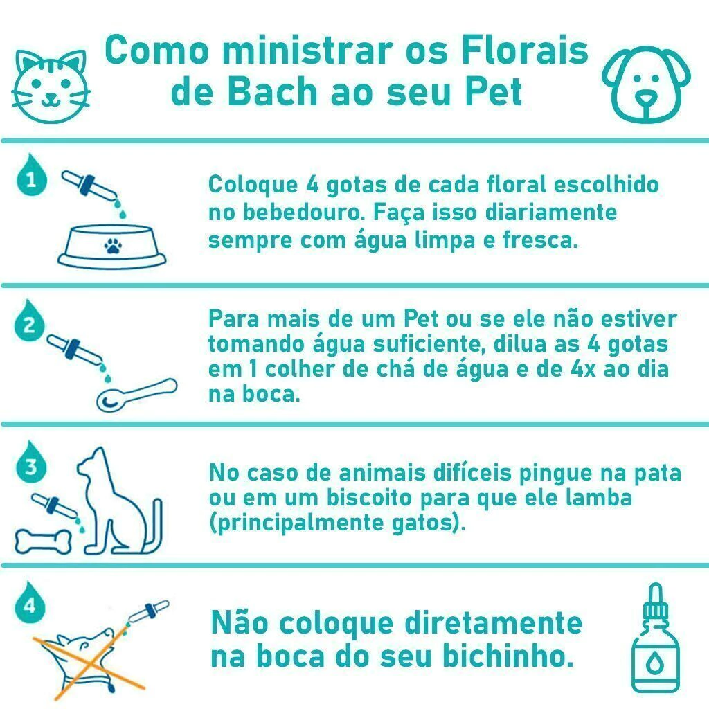 Apesar de serem formulados com essências de flores e plantas, na maioria das vezes é recomendado consultar um veterinário ou um especialista em comportamento animal. O primeiro ponto para iniciar uma terapia com floral é identificar qual é o problema do seu Pet. A dose pode variar de acordo com a necessidade, mas geralmente recomenda-se o uso 4 vezes por dia por via oral. Se acontecer do Pet não aceitar a aplicação direto na boca, aplique as gotas diretamente na água ou na comida do Pet.